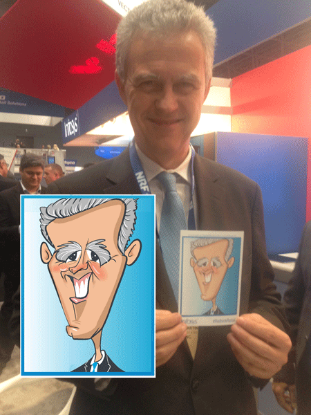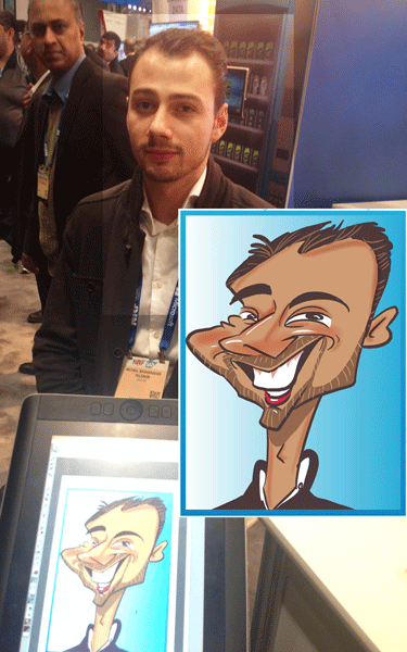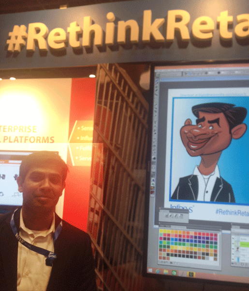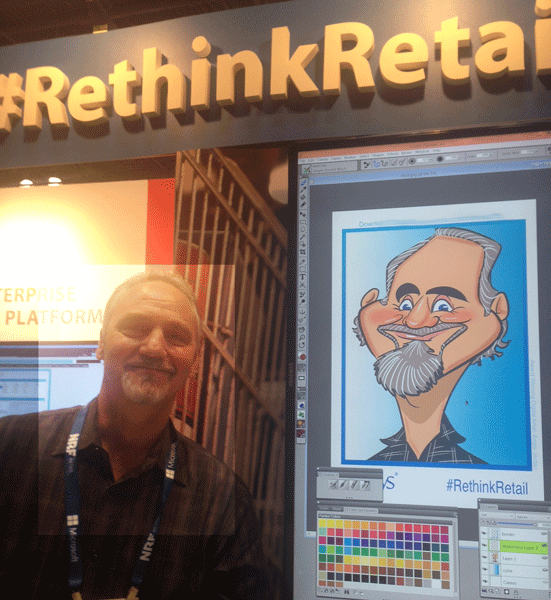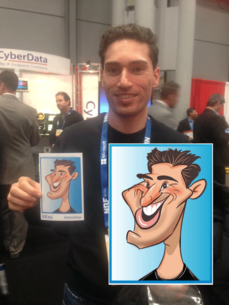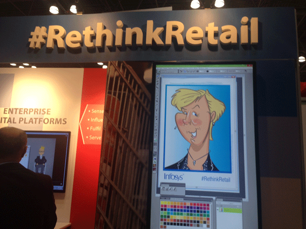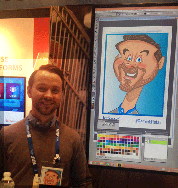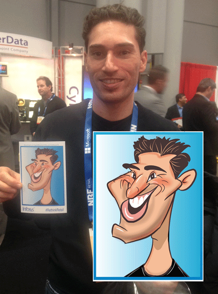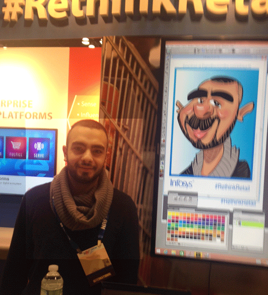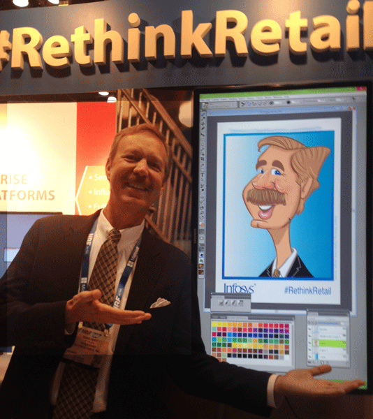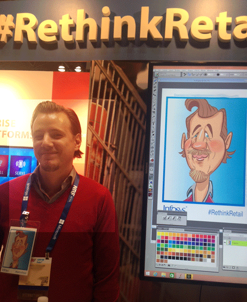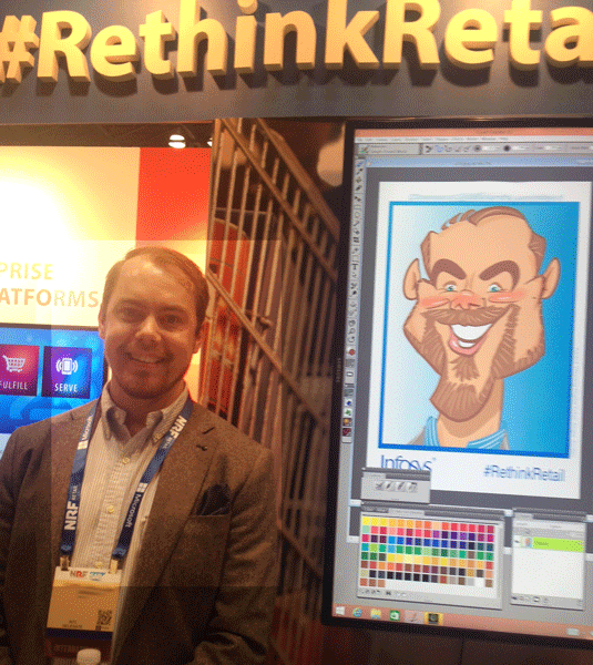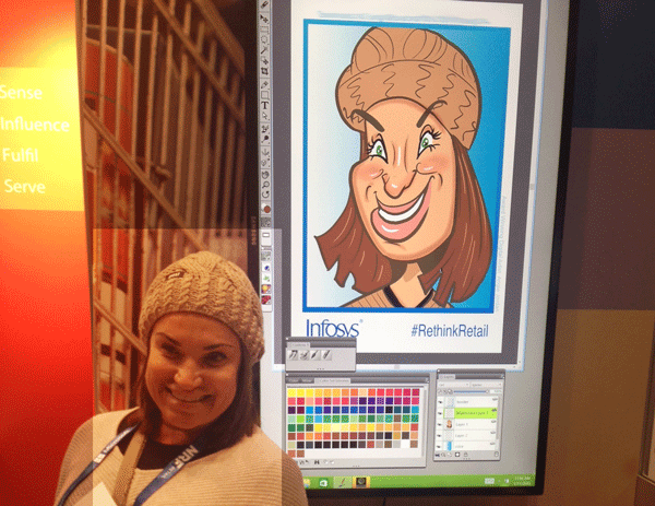 The theatre, excellent shopping, and great restaurants – what else can a lady need? New York City has it all, as well as the National Retail Foundation Big Show 2015 Expo and Convention. I’m here to work with Infosys, a frequent client of mine and leader in the technology and consulting industries. I’m drawing digital caricatures at their expo booth for the three-day event. The NRF Expo gathers leading companies from the retail, technology, and finance industries to discuss the ever-changing face of consumer products and services.